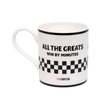 Unsere Tasse zeigt sein klassisches Zitat, abgestimmt auf die Farben seines legendären Peugeot-Teamtrikots.